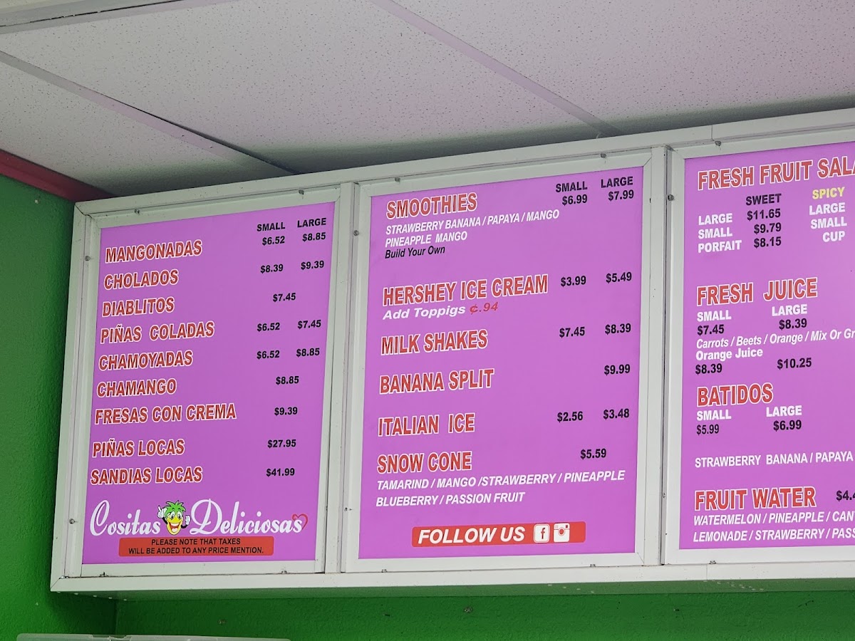 Sandía, piña, melón, mango, limonada, fresa, parcha, horchata, jamaica. coco / Watermelon, pineapple, cantaloupe, mango, lemonade, strawberry, passion fruit.