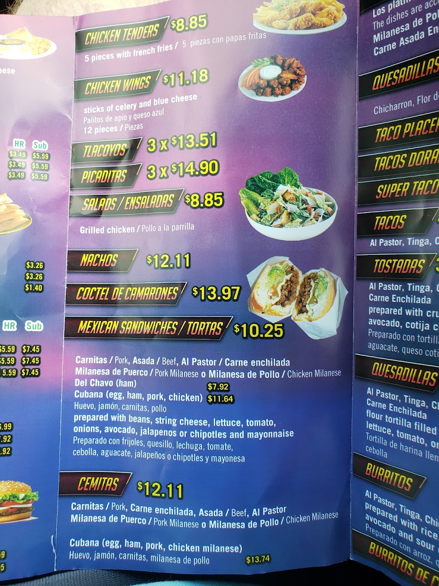 Huevo, jamón, carnitas y pollo. Preparado con frijoles, quesillo, lechuga, tomate, cebolla, aguacate, jalapeños o chipotles y mayonesa. / Egg, ham, pork and chicken. Prepared with beans, string cheese, lettuce, tomato, onions, avocado, jalapenos or chipotle and mayonnaise.